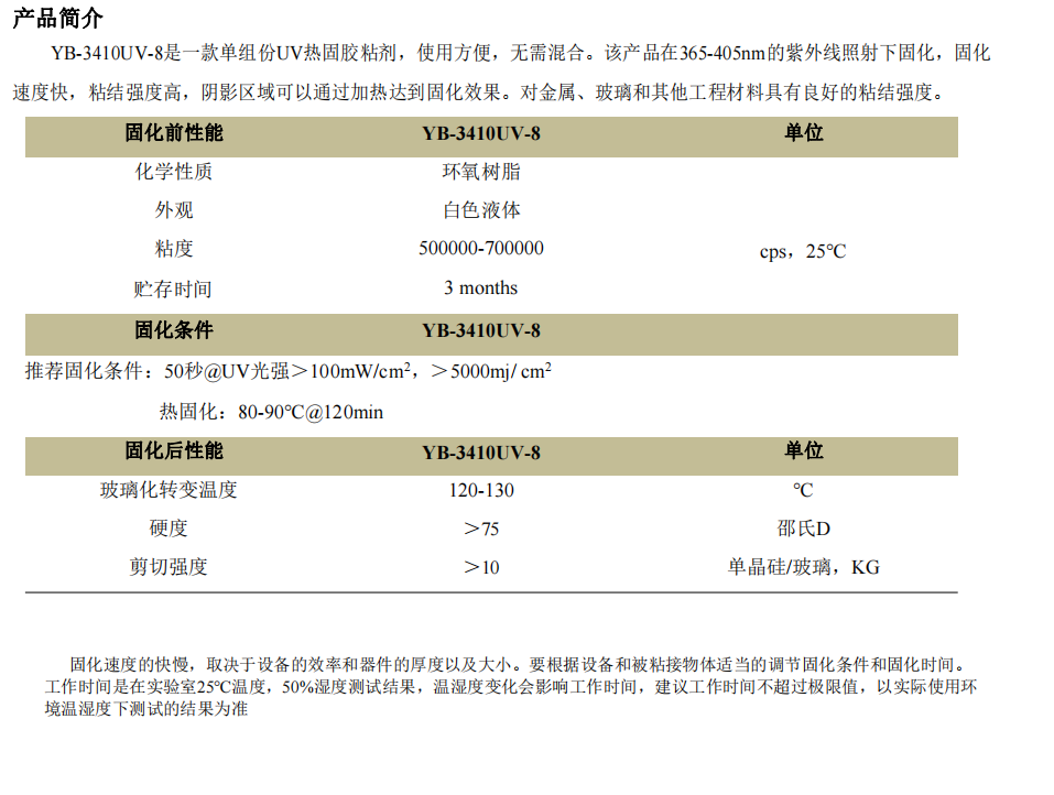 UV热固胶 YB-3410UV-8「查看详情」
